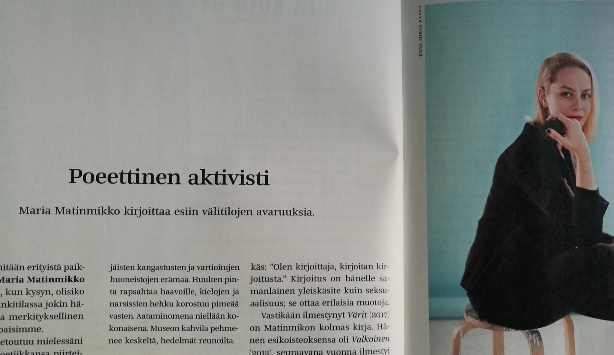 Haastattelu kirjallisuuslehti Parnassossa 2/2017. Kirjoittaja: Virpi Alanen. Kuva: Mira Kakko.