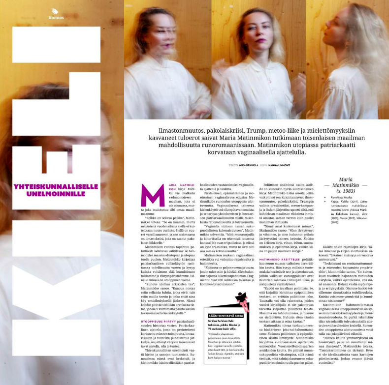 Kritiikki Käkriäisessä 2/2019, jota julkaisee Helsingin yliopiston kotimaisen kirjallisuuden opiskelijoiden ainejärjestö Putkinotko. Kirjoittaja: Lydia Lehtola.